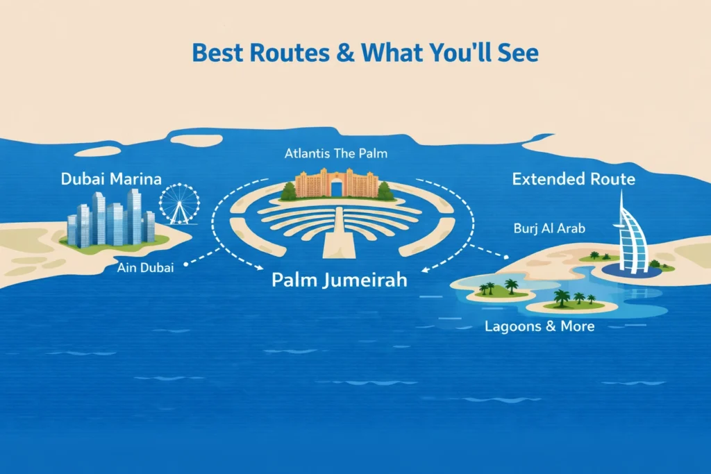 You can see the city in a whole new way when you sail around Palm Jumeirah. From the water, you can see the island’s unusual shape and get a close-up look at Atlantis The Palm. This route is often part of longer tours, which give you a lot of time to take in the sights. It’s a chance to see one of Dubai’s most famous landmarks from a different angle.